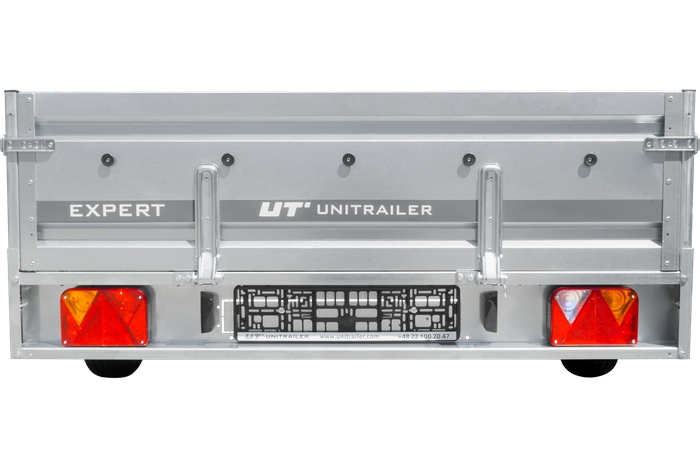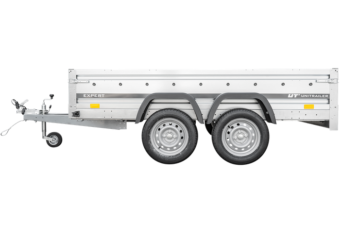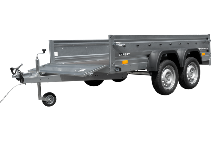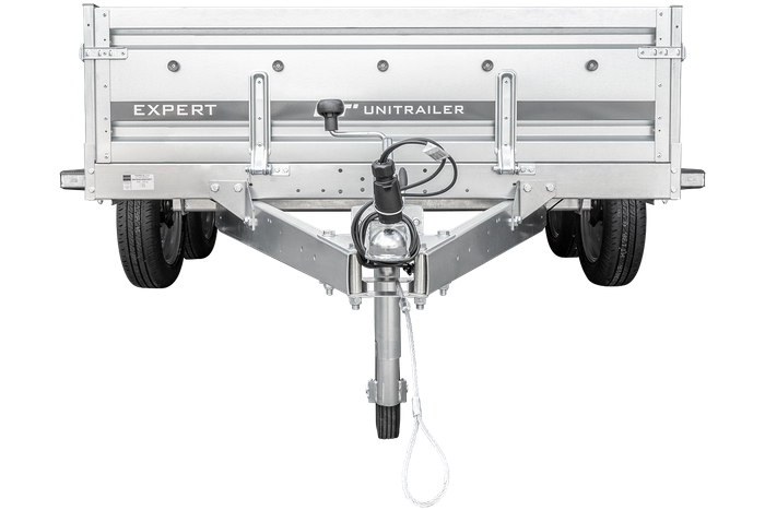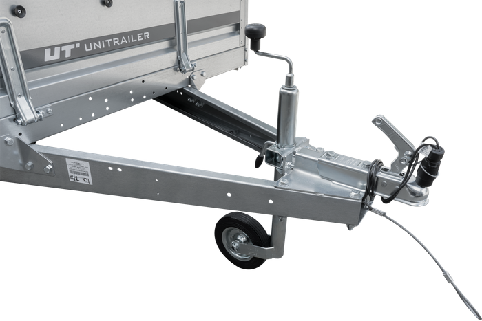 - Timon en V inclinable, qui peut être replié à tout moment sous la plaque de plancher de la remorque.