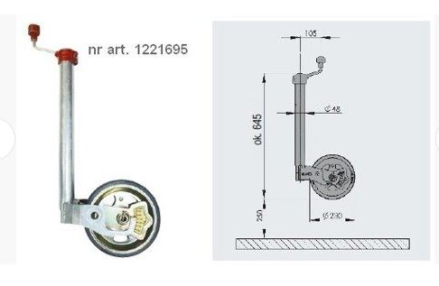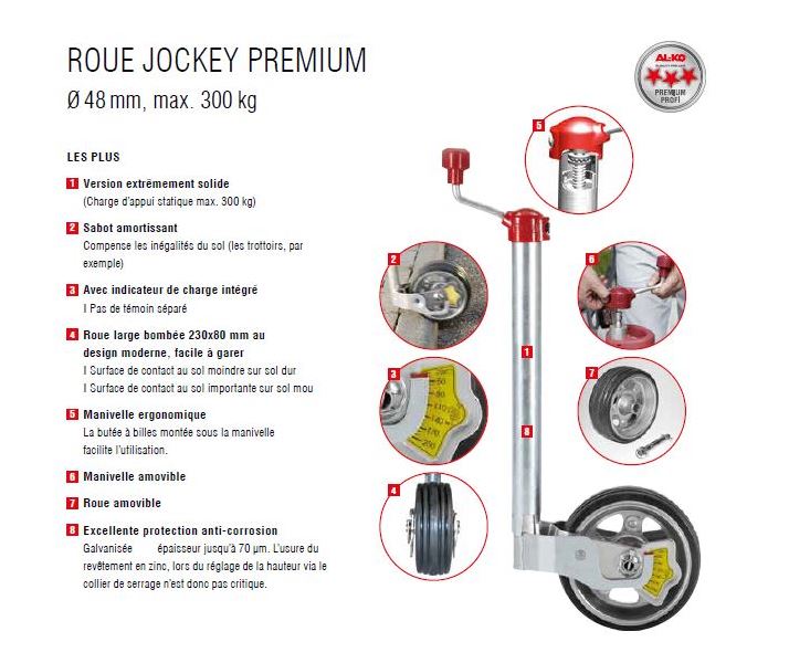Roue jockey avec balance d'AL-KO avec une roue d'un diamètre de 48 mm. La roue a un indicateur de charge et une couche anti-corrosion. Capacité de charge statique : 300 kg, dimensions de la roue : 230 x 80